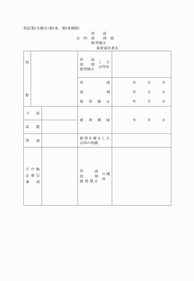 第6条 改刻その他の理由により使用しなくなった公印は、別記第2号様式による公印使用廃止届を添えて事務局長に引継がなければならない。