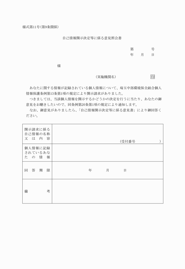 第9条 条例第20条第1項に規定する通知は、自己情報開示決定等に係る意見照会書(様式第11号)により行うものとする。